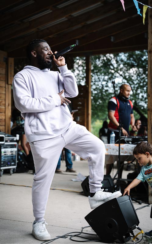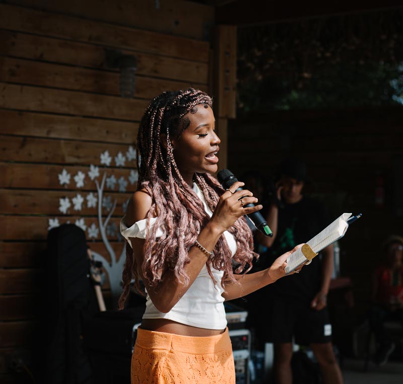 On Saturday, July 20, we presented the Art on My Mind 2024 Showcase as part of the annual Farm Festival. The showcase featured DJ J Rebel, performances by stellar R&B singer Kibra, and unparalleled hip hop artist Dynesti along with up and coming rapper King Cruff. Three participants from our songwriting and performance workshops, Angelique Dancel, Brainer Nwabeke, and Taylor Dallin, also performed. Prior to performing, each emerging artist received individualized coaching to prepare them to take the stage. This was a crucial artistic development opportunity, which gave our program participants hands-on experience rehearsing and performing for a live audiences.