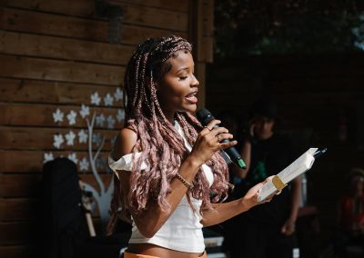 In one of the workshops, participants were invited to perform one song or poem. All performers were coached and given key feedback. They were reminded to walk onto the stage with confidence, be mindful of their posture, and to remember to project their voice and enunciate clearly. The facilitators explained that physical gestures or choreography had to be bold and dramatic enough so audience members in the very back could see. Participants learned that if you want to engage meaningfully with an audience, you need to connect and allow yourself to be vulnerable. It is also important to know your song thoroughly, to vary your pace and rhythm, to synchronize your movements with the beat, and to show your emotions and vulnerability. They learned it is critical as a performer to look into the eyes of audience members, to interact with them, and to realize that you can affect their energy and mood.