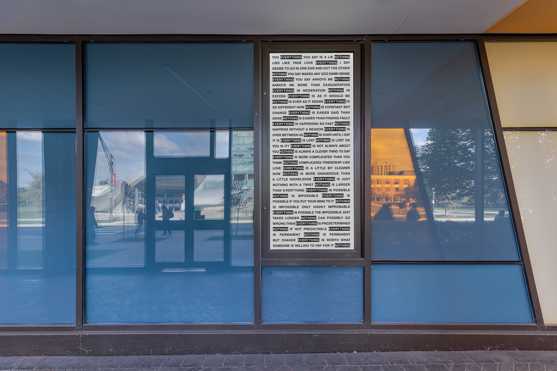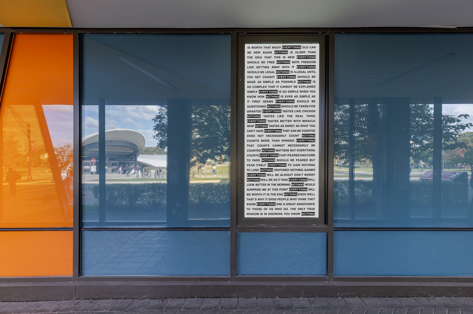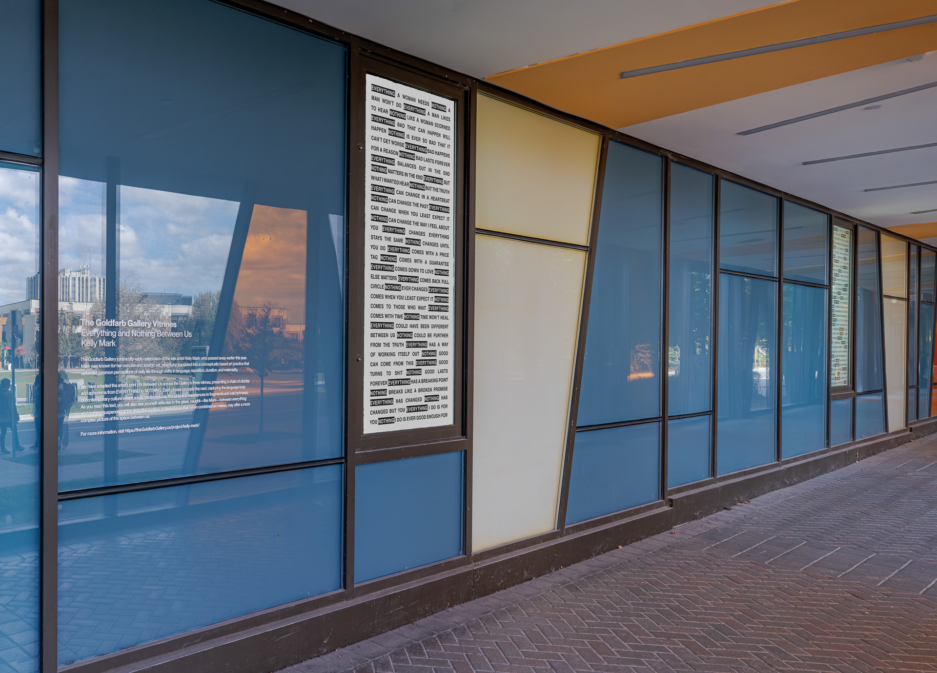 For the Gallery’s three vitrines, we have transcribed the dialogue from this video and her print EN Between Us, presenting Mark’s chain of aphorism across the glass façade of the windows. In this setting, Mark’s collection of sayings capture a melancholy that is not only a reflection of the artist, who in her final year’s became increasingly isolated, but also mirror the language loops of contemporary culture where social media reduces thoughts and experiences to fragments and catchphrases. As passers-by read, they will see themselves reflected in the glass around them, caught—like Mark—between “everything” and “nothing,” suspended at the reductive surface of stereotypes that when combined may offer a more complex glimpse at themselves.