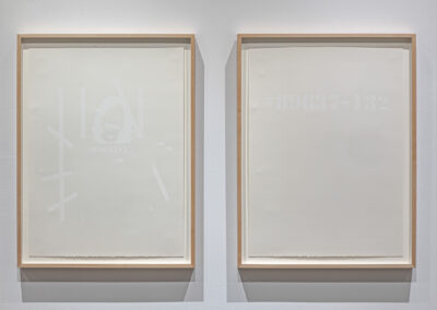 Poitras’ subtle use of language, as we can see in both Small Matters and in the untitled prints also featured in this exhibition, was deeply informative to Belmore’s early practice in understanding the power of minimalistic gestures. Belmore often uses simple binary code patterns, embedding language within his own artistic process, which is subtly present in Turbulent Air – Turbulent Water, 2024. In Belmore’s work, language functions not only as code but also as a structuring device—marking presence, registering histories, and pointing to what lies beyond language, opening onto a broader contemplation of time. Time scales are a significant thematic within this constellation of artists, and Belmore’s ongoing work with rocks, as well as with this new iteration of Resolve presented here in a grid formation, is demonstrative of his own investment in deep time. Within Anishinaabe culture, rocks are considered grandfathers and are witnesses to the passage of time. Rocks hold the knowledge and histories of the land, water, and the beings with whom we all share space. (3)